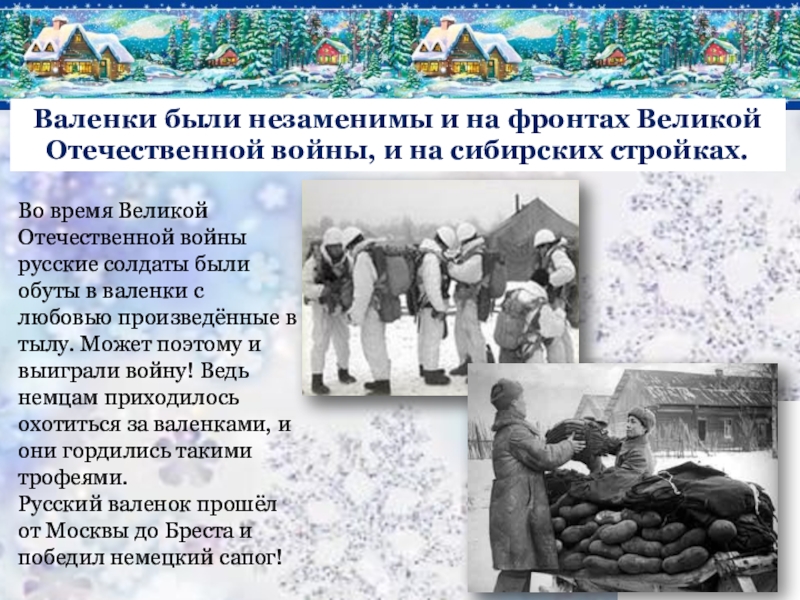 Во время Великой Отечественной войны русские солдаты были обуты в валенки с любовью произведённые в тылу. Может поэтому и выиграли войну! Ведь немцам приходилось охотиться за валенками, и они гордились такими трофеями.