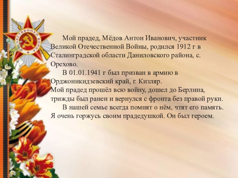 г в Сталинградской области Даниловского района, с. Орехово. В 01.01.1941 г был призван в армию в Орджоникидзевский край, г. Кизляр. Мой прадед прошёл всю войну, дошел до Берлина, трижды был ранен и вернулся с фронта без правой руки. В нашей семье всегда помнят о нём, чтят его память. Я очень горжусь своим прадедушкой. Он был героем.