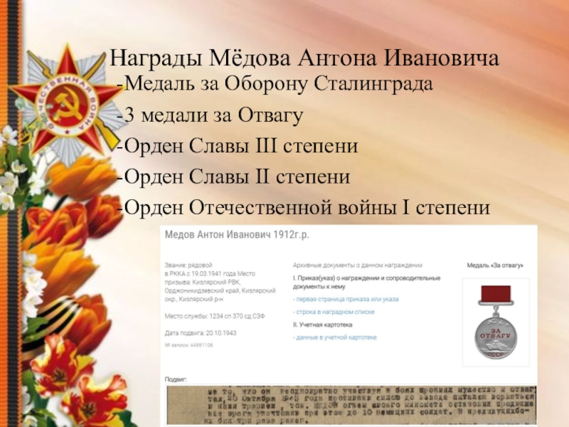 Награды Мёдова Антона Ивановича-Медаль за Оборону Сталинграда-3 медали за Отвагу-Орден Славы III степени-Орден Славы II степени-Орден Отечественной