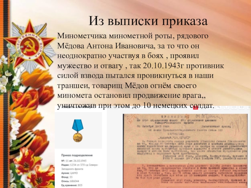 Из выписки приказа  Минометчика минометной роты, рядового Мёдова Антона Ивановича, за то что он неоднократно участвуя