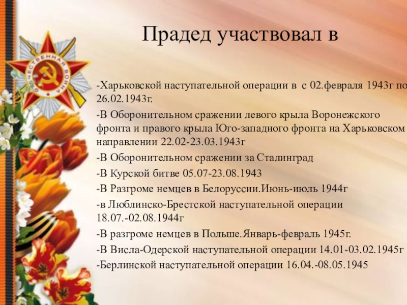 Прадед участвовал в  -Харьковской наступательной операции в с 02.февраля 1943г по 26.02.1943г.-В Оборонительном сражении левого крыла