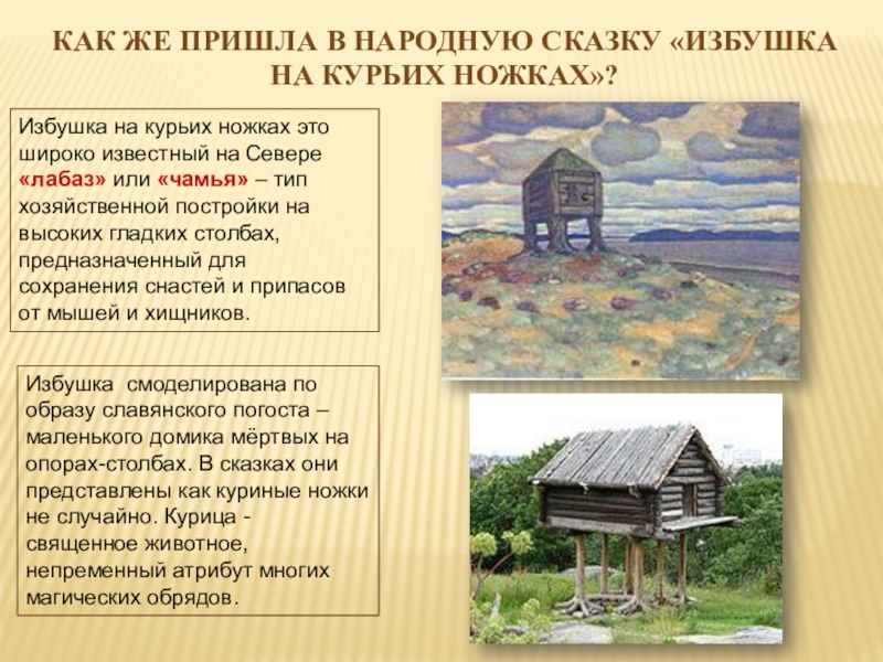 Избушка смоделирована по образу славянского погоста – маленького домика мёртвых на опорах-столбах. В сказках они представлены как куриные ножки не случайно. Курица - священное животное, непременный атрибут многих магических обрядов.