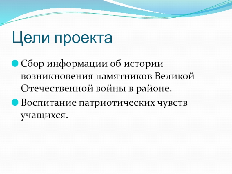 Цели проектаСбор информации об истории возникновения памятников Великой Отечественной войны в районе.Воспитание патриотических чувств учащихся.