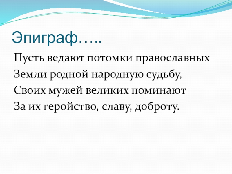 Эпиграф…..Пусть ведают потомки православныхЗемли родной народную судьбу,Своих мужей великих поминаютЗа их геройство, славу, доброту.