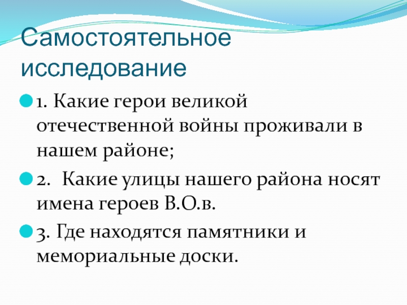 Самостоятельное исследование1. Какие герои великой отечественной войны проживали в нашем районе;2. Какие улицы нашего района носят имена