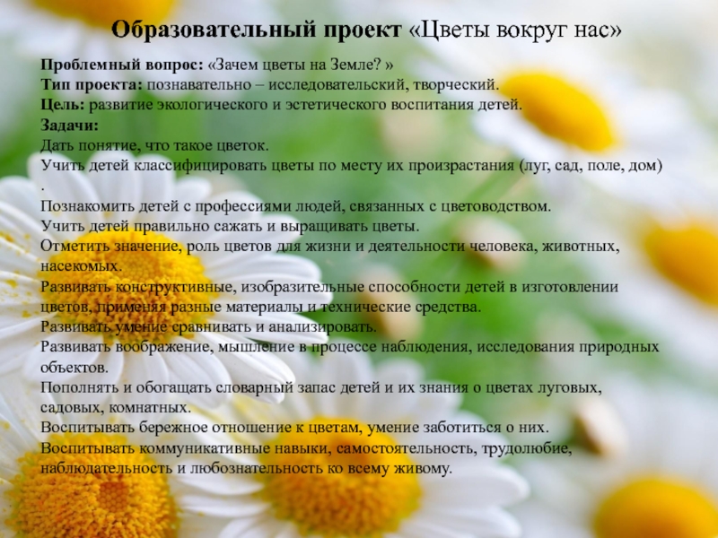 4. Разработать содержание образовательного проекта «Цветы вокруг нас», направленного на формирование экологических представлений.