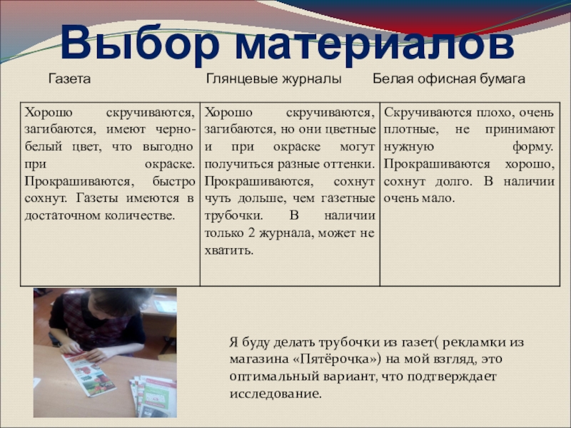 Я буду делать трубочки из газет( рекламки из магазина «Пятёрочка») на мой взгляд, это оптимальный вариант, что подтверждает исследование.