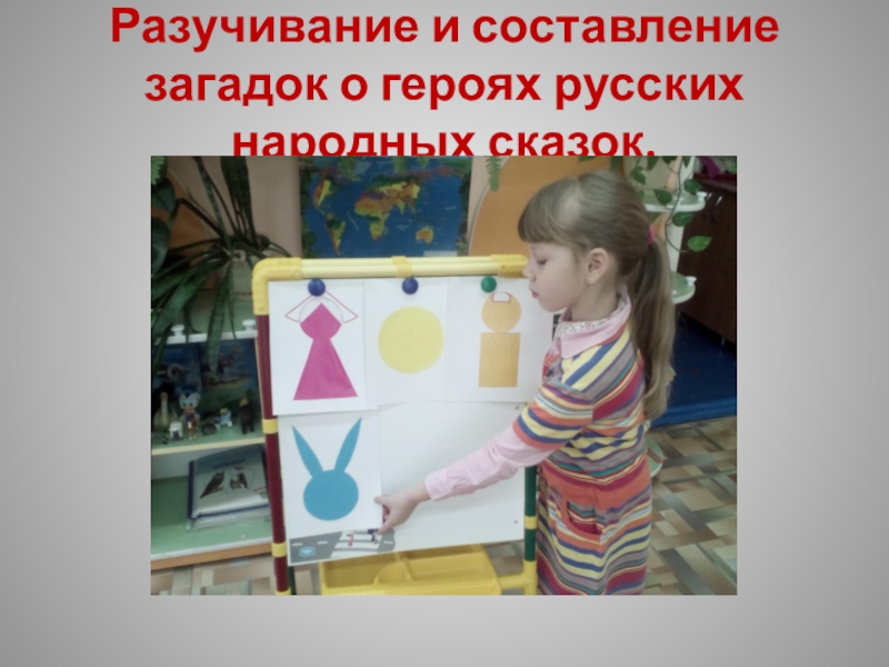 Слайд 36Разучивание и составление загадок о героях русских народных сказок.