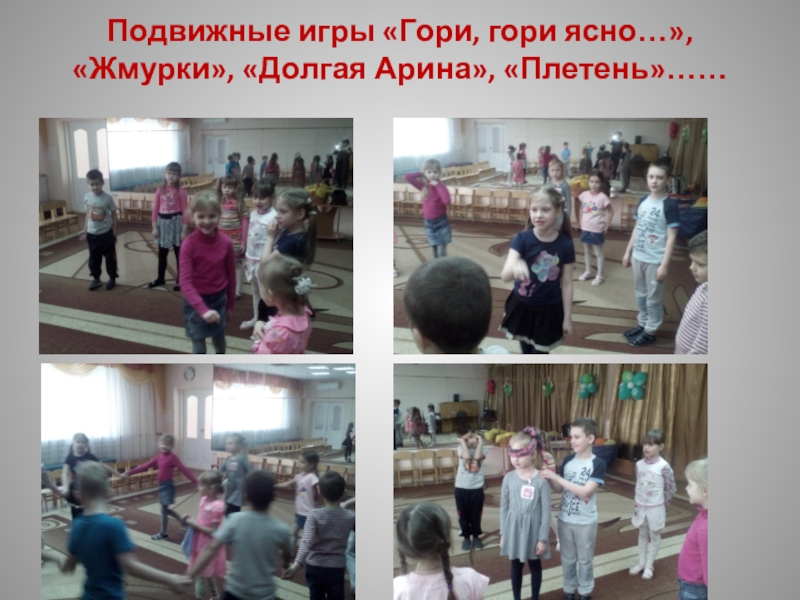 Слайд 26Подвижные игры «Гори, гори ясно…», «Жмурки», «Долгая Арина», «Плетень»……