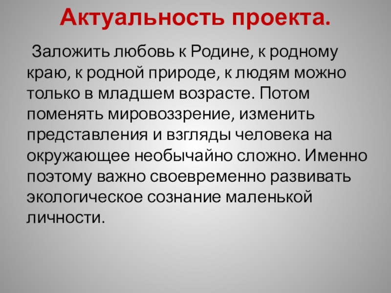 природе, к людям можно только в младшем возрасте. Потом поменять мировоззрение, изменить представления и взгляды человека на окружающее необычайно сложно. Именно поэтому важно своевременно развивать экологическое сознание маленькой личности.