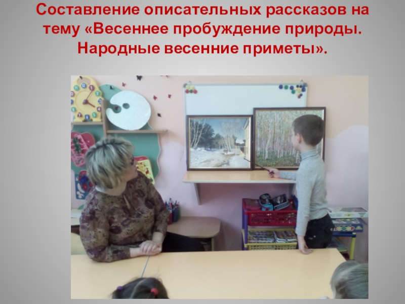 Слайд 31Составление описательных рассказов на тему «Весеннее пробуждение природы. Народные весенние приметы».