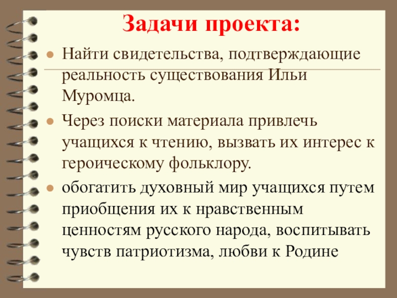 обогатить духовный мир учащихся путем приобщения их к нравственным ценностям русского народа, воспитывать чувств патриотизма, любви к Родине
