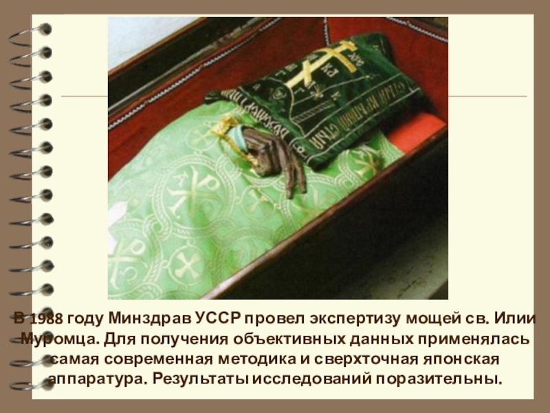 Слайд 31В 1988 году Минздрав УССР провел экспертизу мощей св. Илии Муромца.