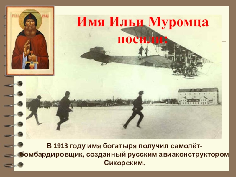 Слайд 41В 1913 году имя богатыря получил самолёт-бомбардировщик, созданный русским авиаконструктором Сикорским.
