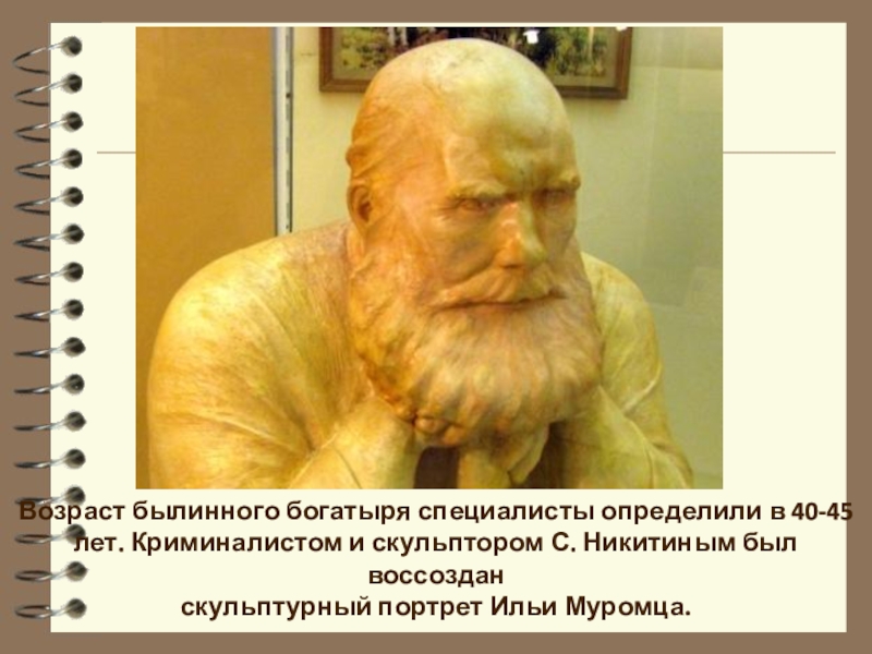 Слайд 32Возраст былинного богатыря специалисты определили в 40-45 лет. Криминалистом и скульптором