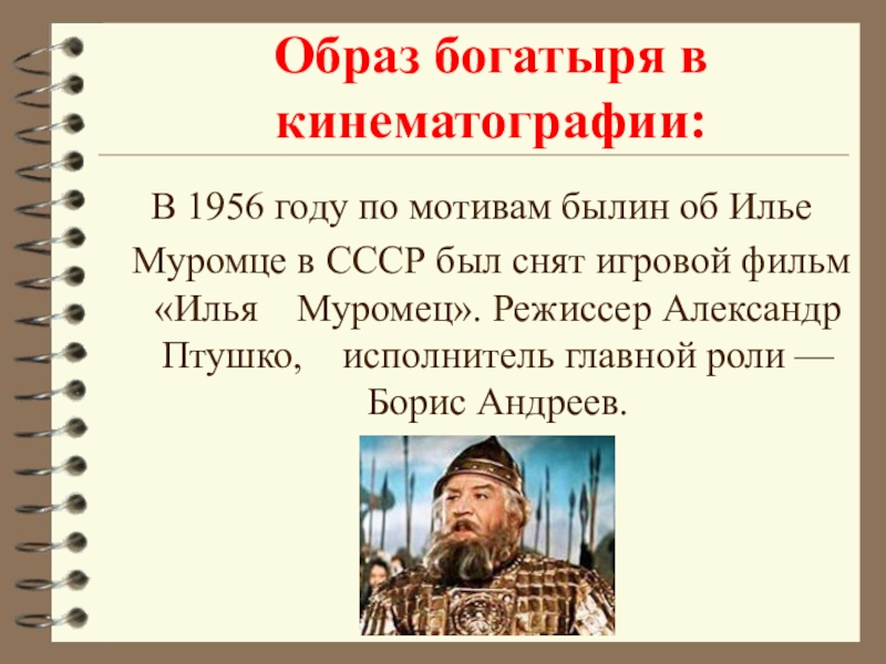 Муромце в СССР был снят игровой фильм «Илья Муромец». Режиссер Александр Птушко, исполнитель главной роли — Борис Андреев.