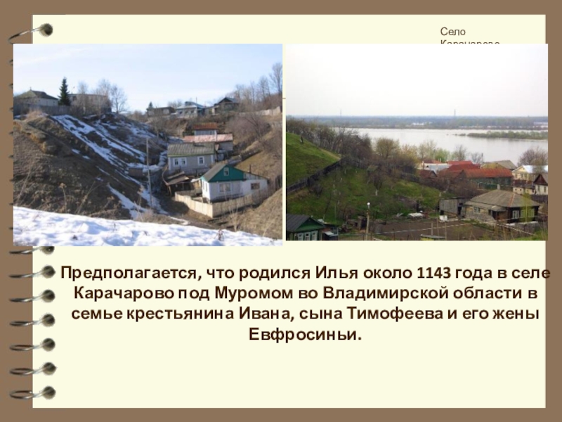 Слайд 20Предполагается, что родился Илья около 1143 года в селе Карачарово под