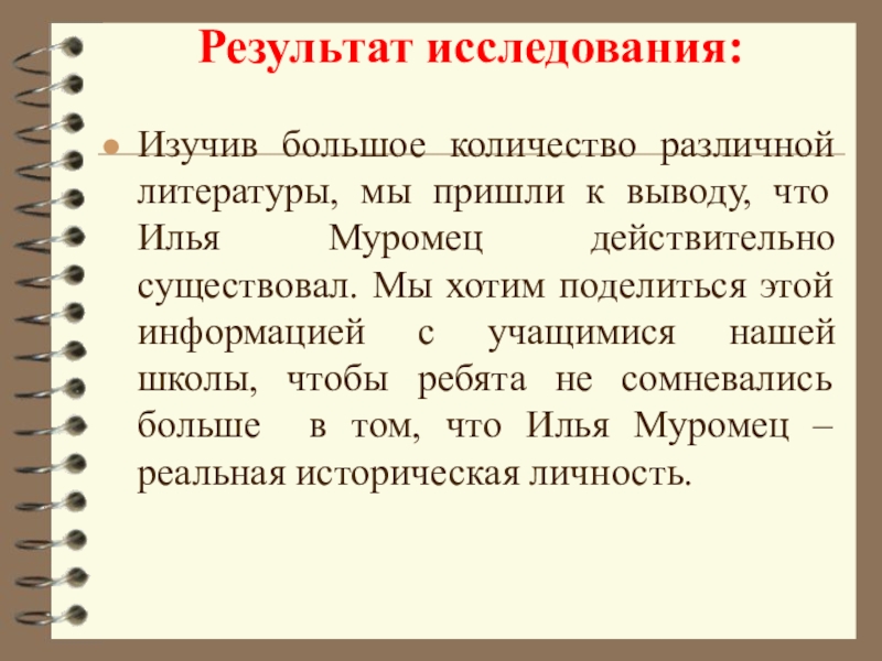 Илья Муромец действительно существовал. Мы хотим поделиться этой информацией с учащимися нашей школы, чтобы ребята не сомневались больше в том, что Илья Муромец – реальная историческая личность.