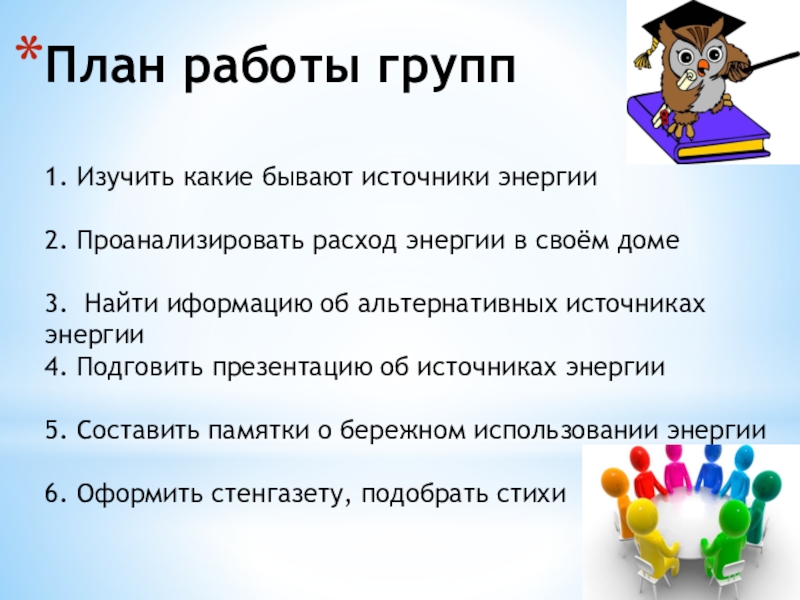 Слайд 7План работы групп 1. Изучить какие бывают источники энергии 2. Проанализировать расход энергии