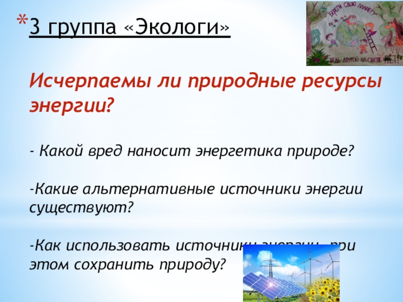 3 группа «Экологи»  Исчерпаемы ли природные ресурсы энергии?  - Какой вред наносит энергетика природе?