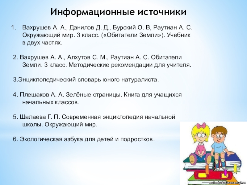 2. Вахрушев А. А., Алхутов С. М., Раутиан А. С. Обитатели Земли. 3 класс. Методические рекомендации для учителя.