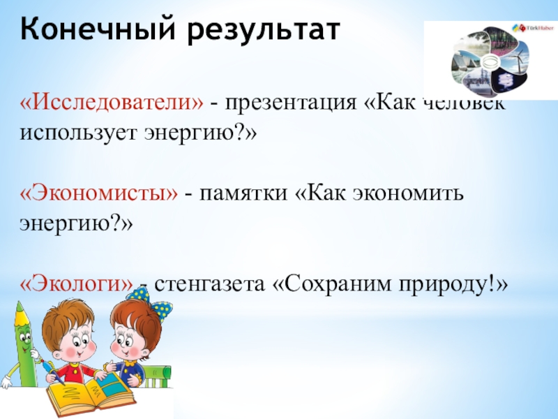 Слайд 6Конечный результат «Исследователи» - презентация «Как человек использует энергию?» «Экономисты» - памятки «Как