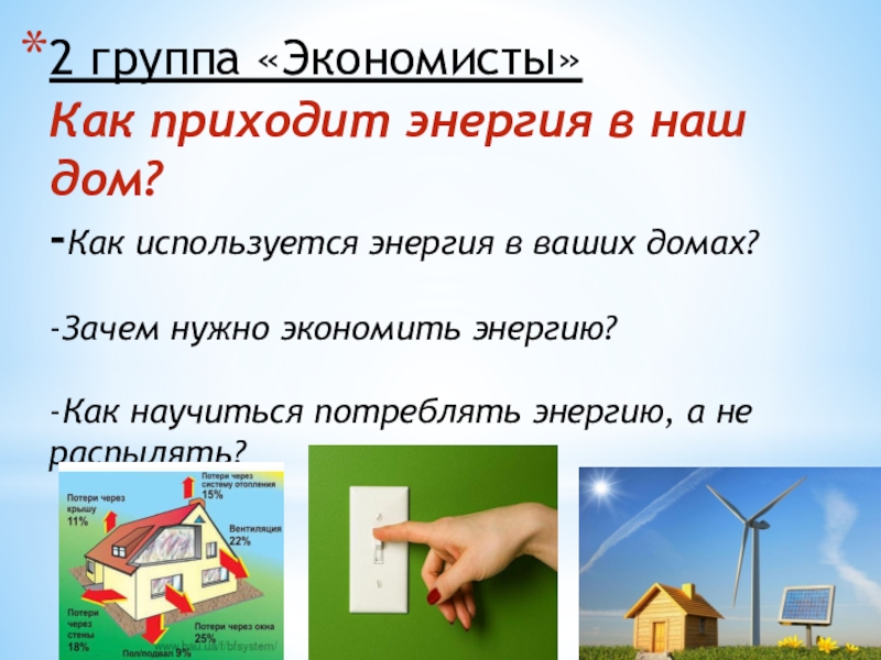 2 группа «Экономисты» Как приходит энергия в наш дом? -Как используется энергия в ваших домах?  -Зачем