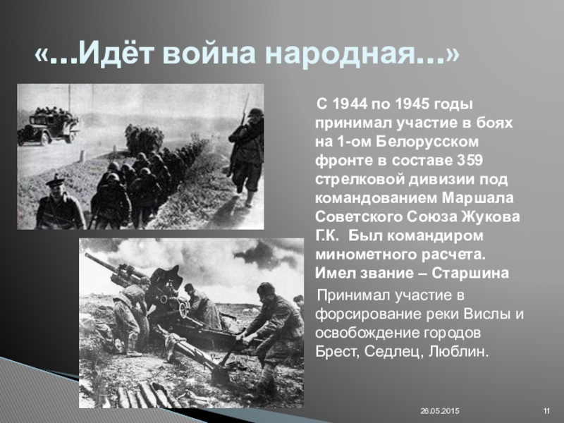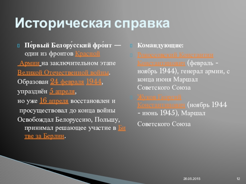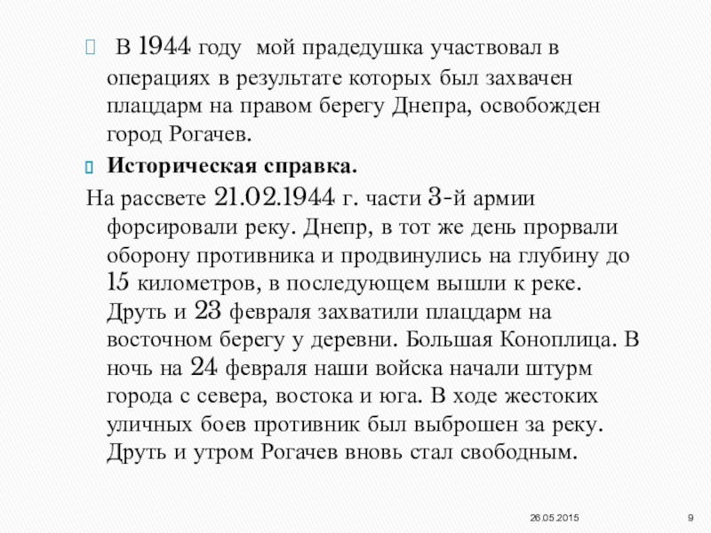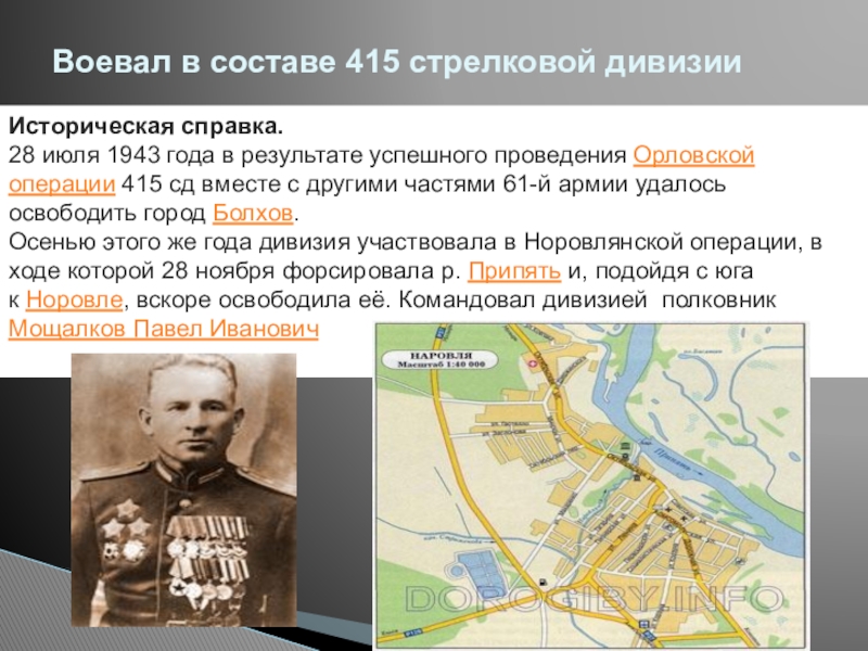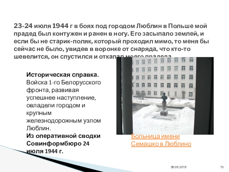 Историческая справка. Войска 1-го Белорусского фронта, развивая успешнее наступление, овладели городом и крупным железнодорожным узлом Люблин.