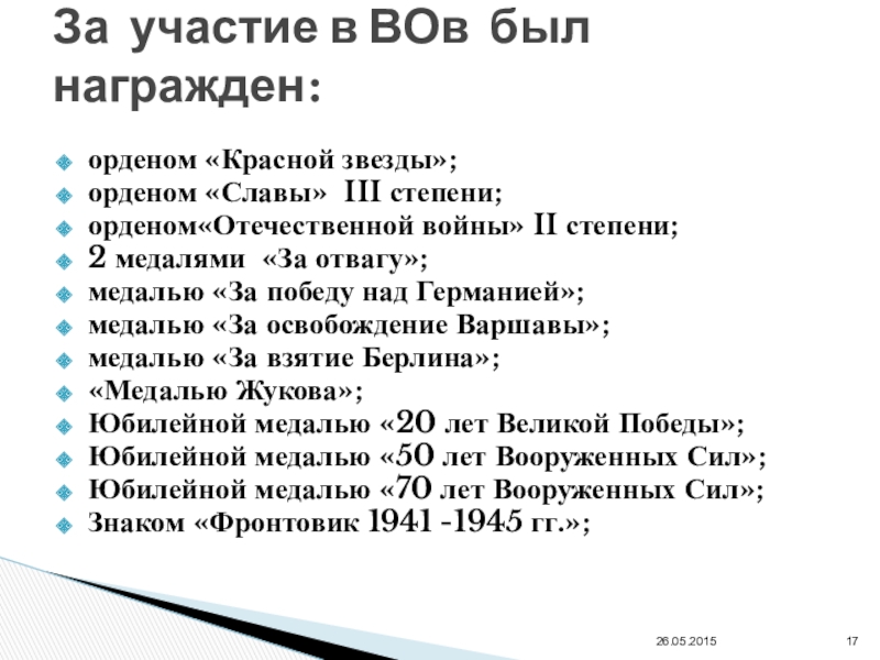 За участие в ВОв был награжден: