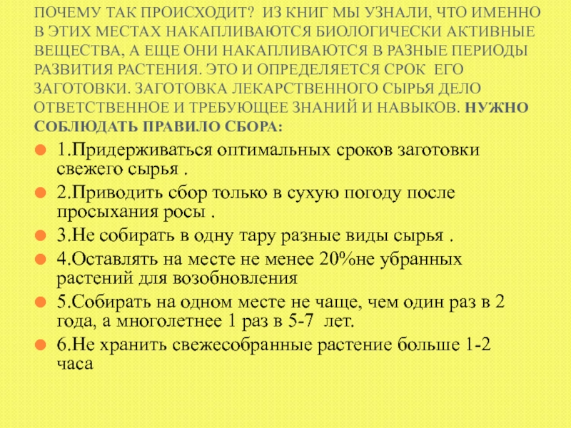 МЕСТАХ НАКАПЛИВАЮТСЯ БИОЛОГИЧЕСКИ АКТИВНЫЕ ВЕЩЕСТВА, А ЕЩЕ ОНИ НАКАПЛИВАЮТСЯ В РАЗНЫЕ ПЕРИОДЫ РАЗВИТИЯ РАСТЕНИЯ. ЭТО И ОПРЕДЕЛЯЕТСЯ СРОК ЕГО ЗАГОТОВКИ. ЗАГОТОВКА ЛЕКАРСТВЕННОГО СЫРЬЯ ДЕЛО ОТВЕТСТВЕННОЕ И ТРЕБУЮЩЕЕ ЗНАНИЙ И НАВЫКОВ. НУЖНО СОБЛЮДАТЬ ПРАВИЛО СБОРА: