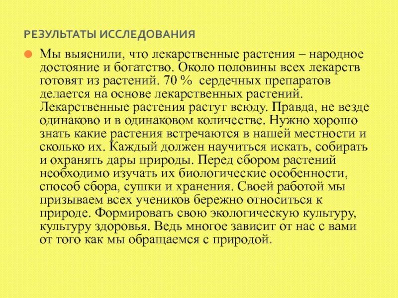 Около половины всех лекарств готовят из растений. 70 % сердечных препаратов делается на основе лекарственных растений. Лекарственные растения растут всюду. Правда, не везде одинаково и в одинаковом количестве. Нужно хорошо знать какие растения встречаются в нашей местности и сколько их. Каждый должен научиться искать, собирать и охранять дары природы. Перед сбором растений необходимо изучать их биологические особенности, способ сбора, сушки и хранения. Своей работой мы призываем всех учеников бережно относиться к природе. Формировать свою экологическую культуру, культуру здоровья. Ведь многое зависит от нас с вами от того как мы обращаемся с природой.
