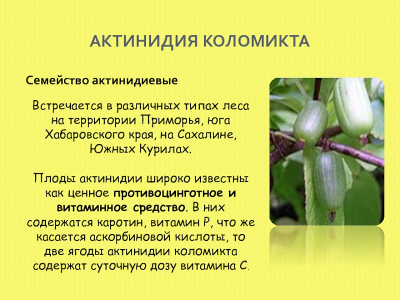 Плоды актинидии широко известны как ценное противоцинготное и витаминное средство. В них содержатся каротин, витамин Р, что же касается аскорбиновой кислоты, то две ягоды актинидии коломикта содержат суточную дозу витамина С.