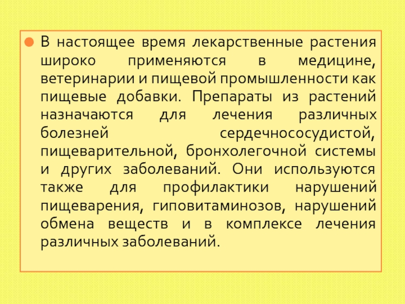 пищевой промышленности как пищевые добавки. Препараты из растений назначаются для лечения различных болезней сердечнососудистой, пищеварительной, бронхолегочной системы и других заболеваний. Они используются также для профилактики нарушений пищеварения, гиповитаминозов, нарушений обмена веществ и в комплексе лечения различных заболеваний.