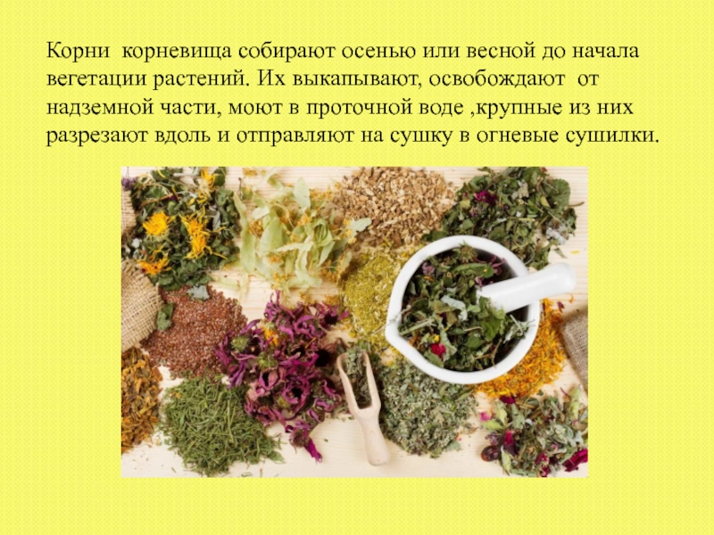 Слайд 35Корни корневища собирают осенью или весной до начала вегетации растений. Их
