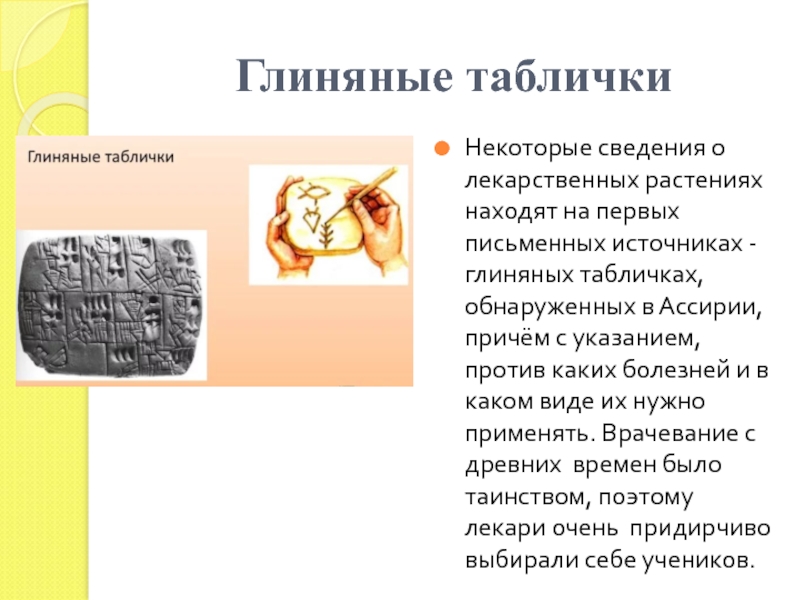- глиняных табличках, обнаруженных в Ассирии, причём с указанием, против каких болезней и в каком виде их нужно применять. Врачевание с древних времен было таинством, поэтому лекари очень придирчиво выбирали себе учеников.