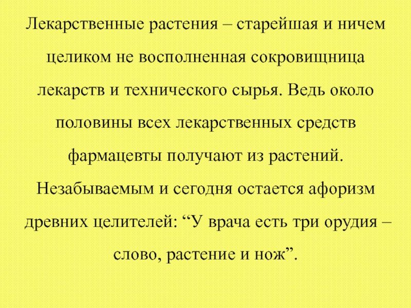 технического сырья. Ведь около половины всех лекарственных средств фармацевты получают из растений. Незабываемым и сегодня остается афоризм древних целителей: “У врача есть три орудия – слово, растение и нож”.