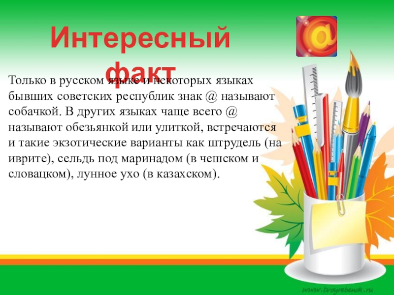 Это сайт презентаций, где можно хранить и обмениваться своими презентациями, докладами, проектами, шаблонами в формате PowerPoint с другими пользователями. Мы помогаем школьникам, студентам, учителям, преподавателям хранить и обмениваться учебными материалами.