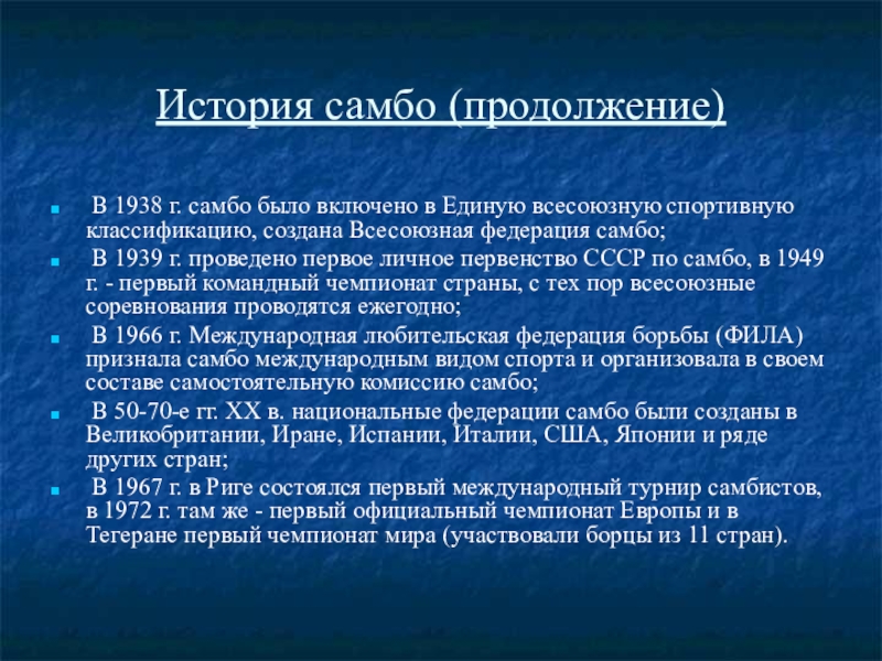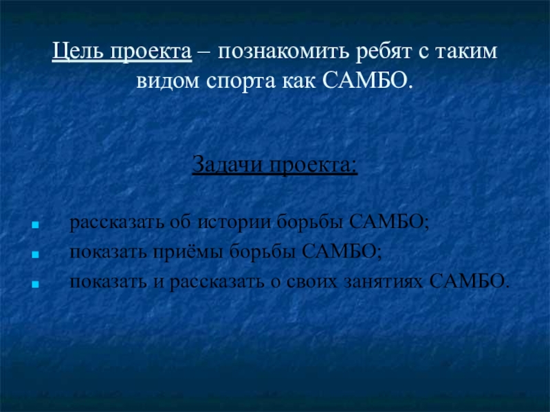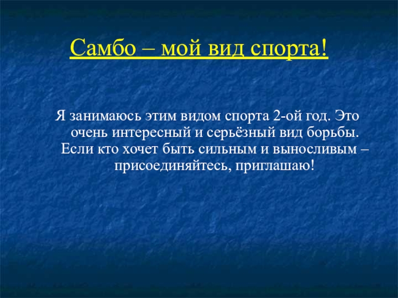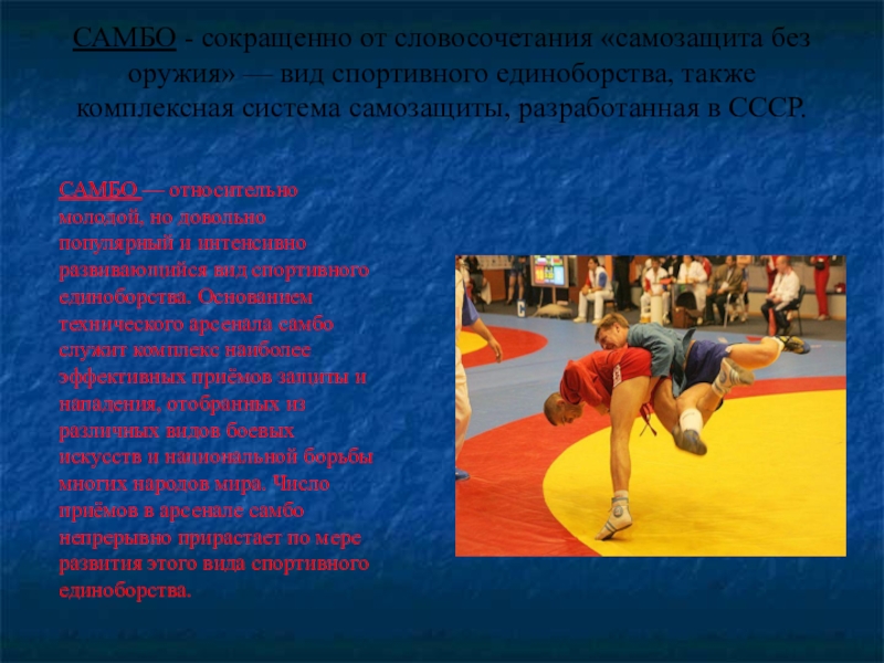 САМБО — относительно молодой, но довольно популярный и интенсивно развивающийся вид спортивного единоборства. Основанием технического арсенала самбо служит комплекс наиболее эффективных приёмов защиты и нападения, отобранных из различных видов боевых искусств и национальной борьбы многих народов мира. Число приёмов в арсенале самбо непрерывно прирастает по мере развития этого вида спортивного единоборства.