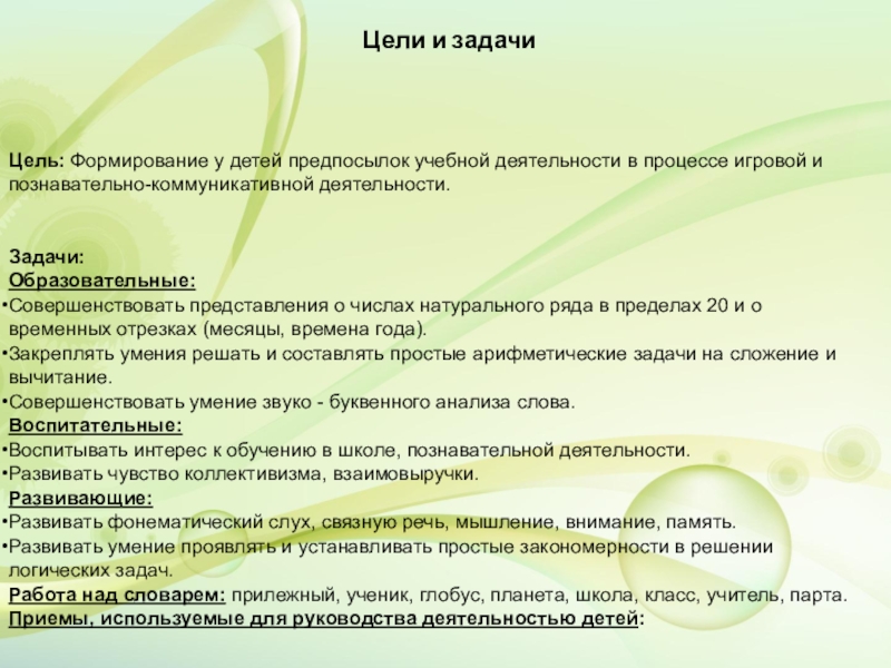 Цель: Формирование у детей предпосылок учебной деятельности в процессе игровой и познавательно-коммуникативной деятельности.