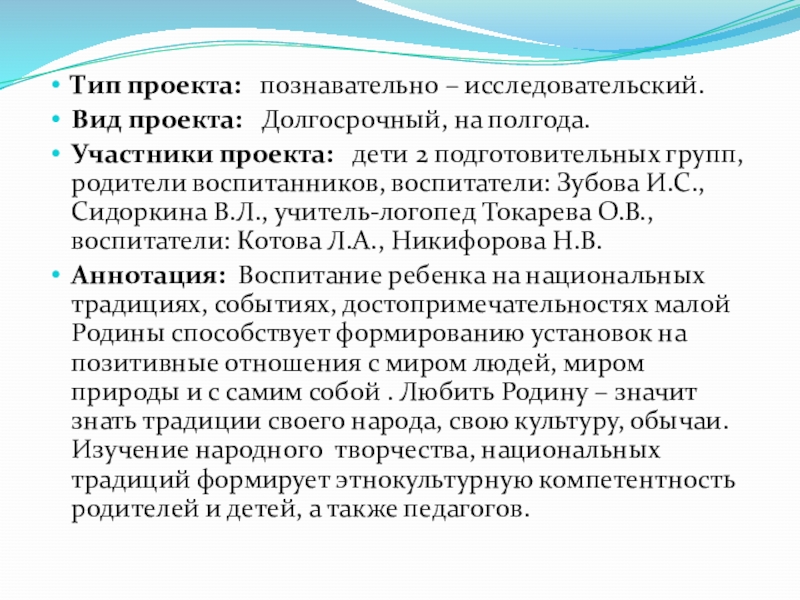 Аннотация: Воспитание ребенка на национальных традициях, событиях, достопримечательностях малой Родины способствует формированию установок на позитивные отношения с миром людей, миром природы и с самим собой . Любить Родину – значит знать традиции своего народа, свою культуру, обычаи. Изучение народного творчества, национальных традиций формирует этнокультурную компетентность родителей и детей, а также педагогов.
