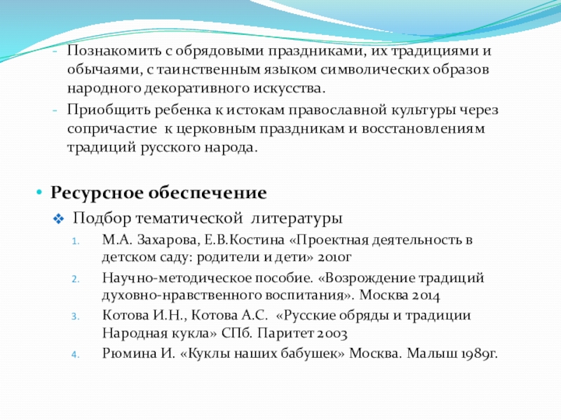 Приобщить ребенка к истокам православной культуры через сопричастие к церковным праздникам и восстановлениям традиций русского народа.