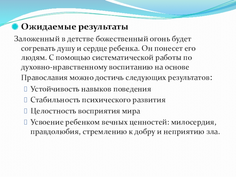 ребенка. Он понесет его людям. С помощью систематической работы по духовно-нравственному воспитанию на основе Православия можно достичь следующих результатов: