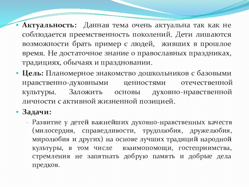 Слайд 3Актуальность: Данная тема очень актуальна так как не соблюдается преемственность поколений.