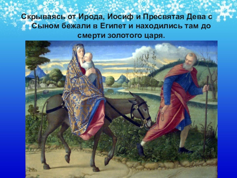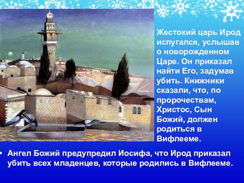 Ангел Божий предупредил Иосифа, что Ирод приказал убить всех младенцев, которые родились в Вифлееме.