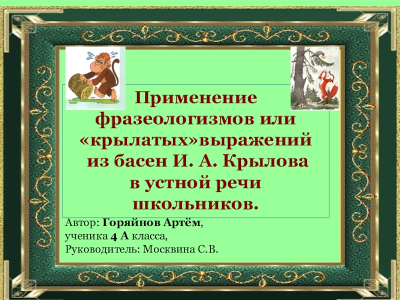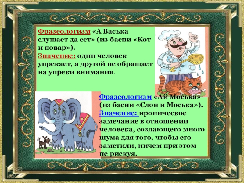 Фразеологизм «Ай Моська» (из басни «Слон и Моська»).