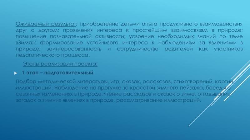 интереса к простейшим взаимосвязям в природе; повышение познавательной активности; усвоение необходимых знаний по теме «Зима»; формирование устойчивого интереса к наблюдениям за явлениями в природе; заинтересованность и сотрудничество родителей как участников педагогического процесса.