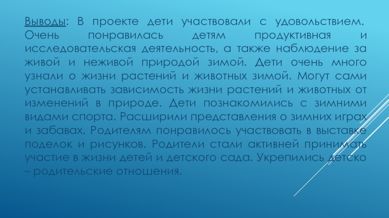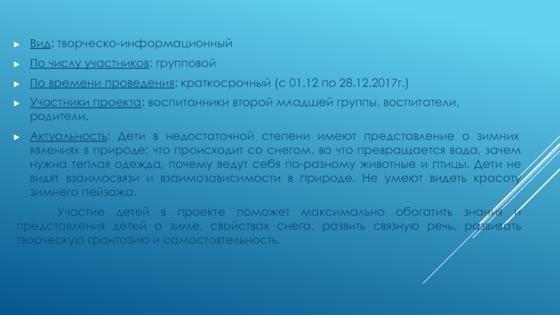 Актуальность: Дети в недостаточной степени имеют представление о зимних явлениях в природе; что происходит со снегом, во что превращается вода, зачем нужна теплая одежда, почему ведут себя по-разному животные и птицы. Дети не видят взаимосвязи и взаимозависимости в природе. Не умеют видеть красоту зимнего пейзажа.