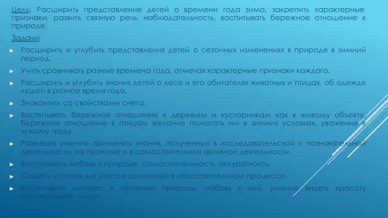 Расширить и углубить представления детей о сезонных изменениях в природе в зимний период.