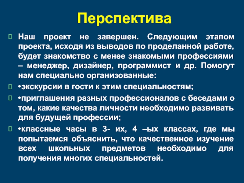 • классные часы в 3- их, 4 –ых классах, где мы попытаемся объяснить, что качественное изучение всех школьных предметов необходимо для получения многих специальностей.