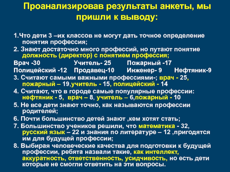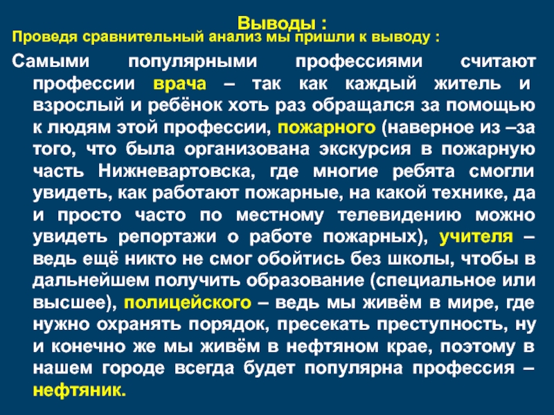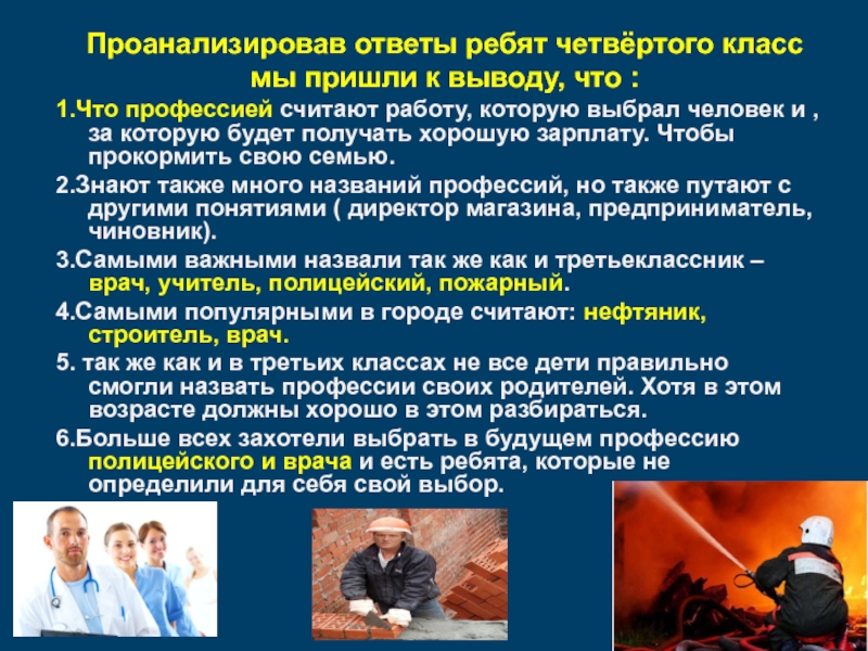 считают профессии врача – так как каждый житель и взрослый и ребёнок хоть раз обращался за помощью к людям этой профессии, пожарного (наверное из –за того, что была организована экскурсия в пожарную часть Нижневартовска, где многие ребята смогли увидеть, как работают пожарные, на какой технике, да и просто часто по местному телевидению можно увидеть репортажи о работе пожарных), учителя – ведь ещё никто не смог обойтись без школы, чтобы в дальнейшем получить образование (специальное или высшее), полицейского – ведь мы живём в мире, где нужно охранять порядок, пресекать преступность, ну и конечно же мы живём в нефтяном крае, поэтому в нашем городе всегда будет популярна профессия – нефтяник.